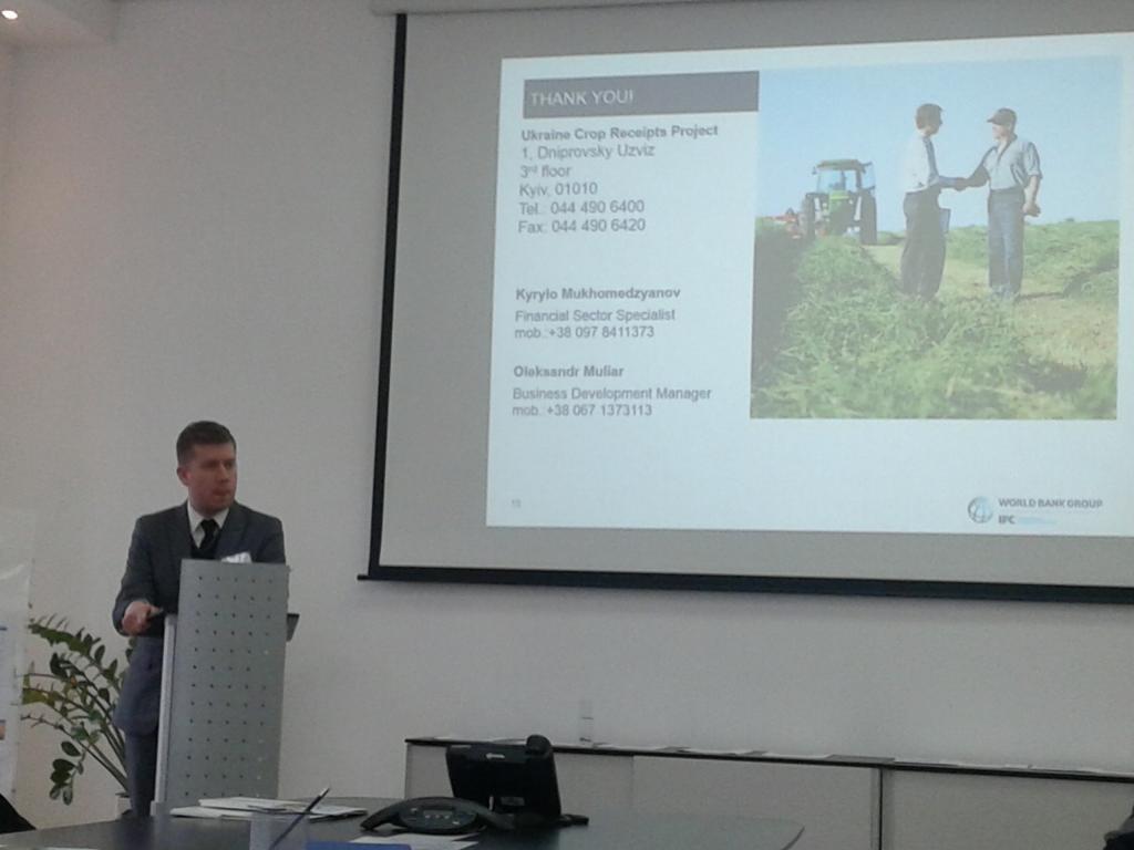 У свої презентації Олександр Муляр розповів, що аграрна розписка – це новий інструмент, який допомагає отримати доступ до фінансових та матеріально-технічних ресурсів під заставу майбутньої сільськогосподарської продукції. Аграрні розписки поділяються на два типи - товарні і фінансові – на виконання яких сільгоспвиробник здійснює, відповідно, поставку продукції або виплату грошових коштів. Крім того, в рамках доповіді було підкреслено переваги розписок для учасників ринку, відмінності від інших фінансових документів та механізм їх функціонування.